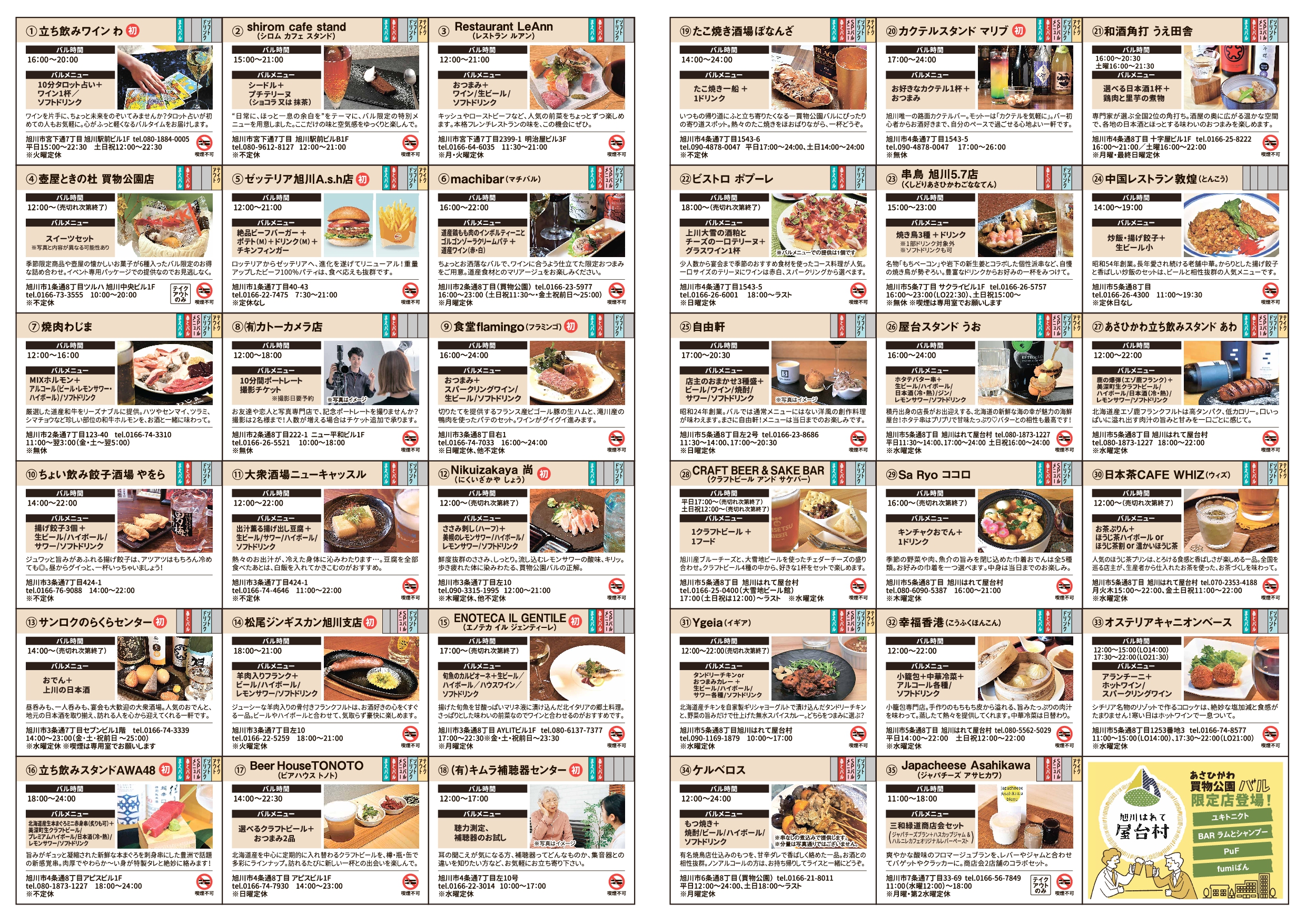 あさひかわ買物公園バルMAPには、参加店のバルメニュー、提供時間、場所などが掲載されています。バルMAPを見ながら、この日だけの特別なバルメニューを楽しんでください